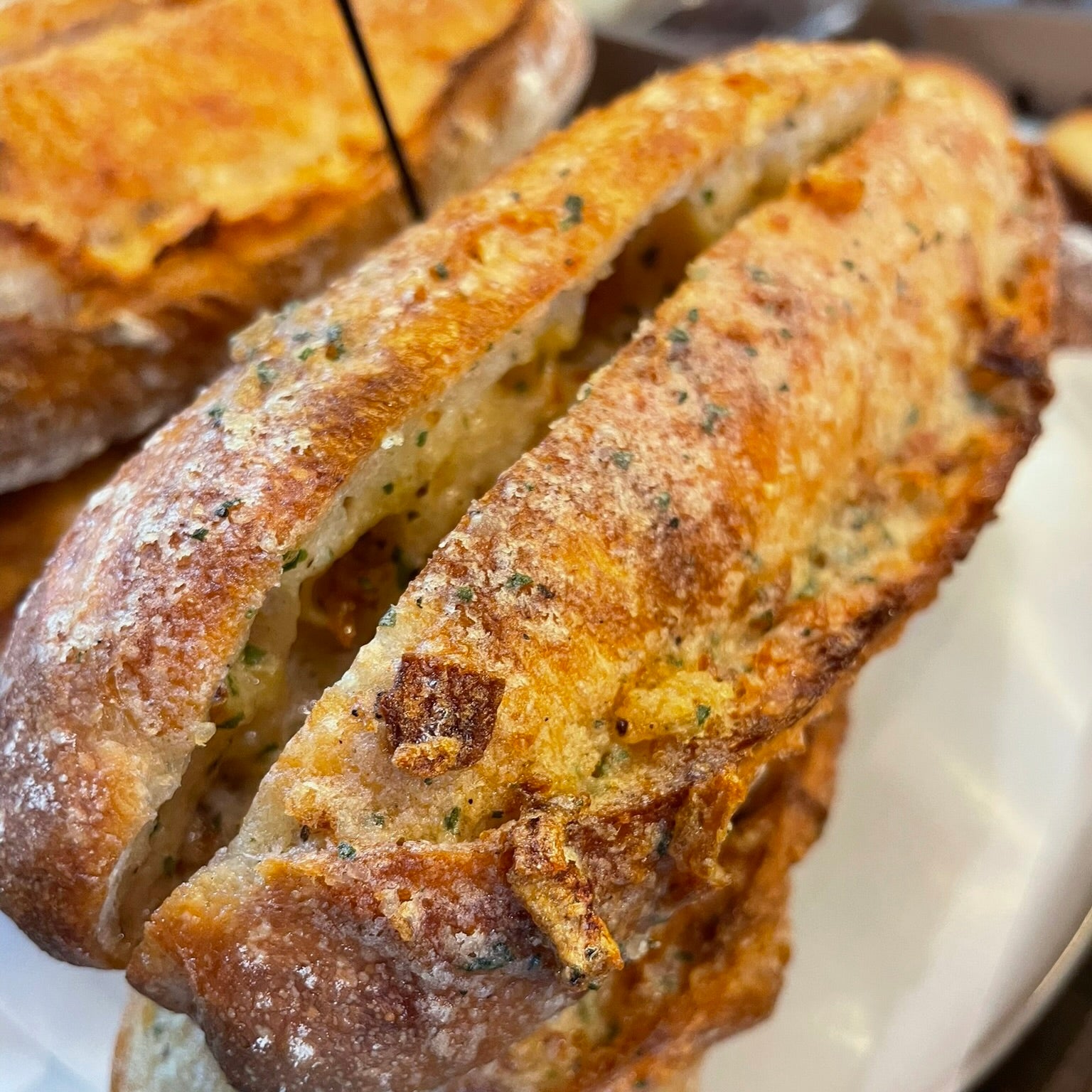 オリーブオイルで煮込んだガーリックとハーブ・スパイス・フライドオニオン・バターをあわせ、たっぷり染み込ませました。