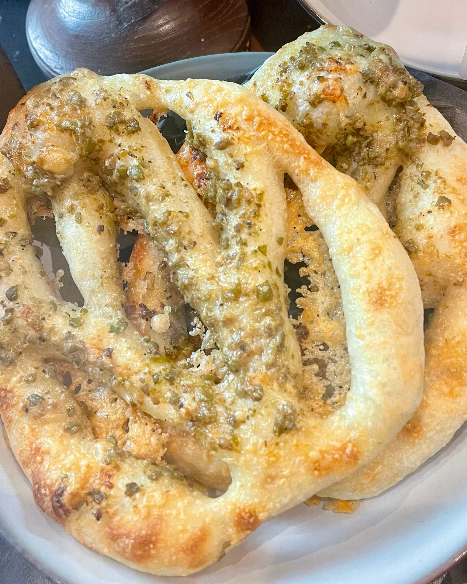 バゲット生地にタプナード(オリーブのペースト)を塗り、グラナパダーノをかけて焼いたおつまみにぴったりのパン。
